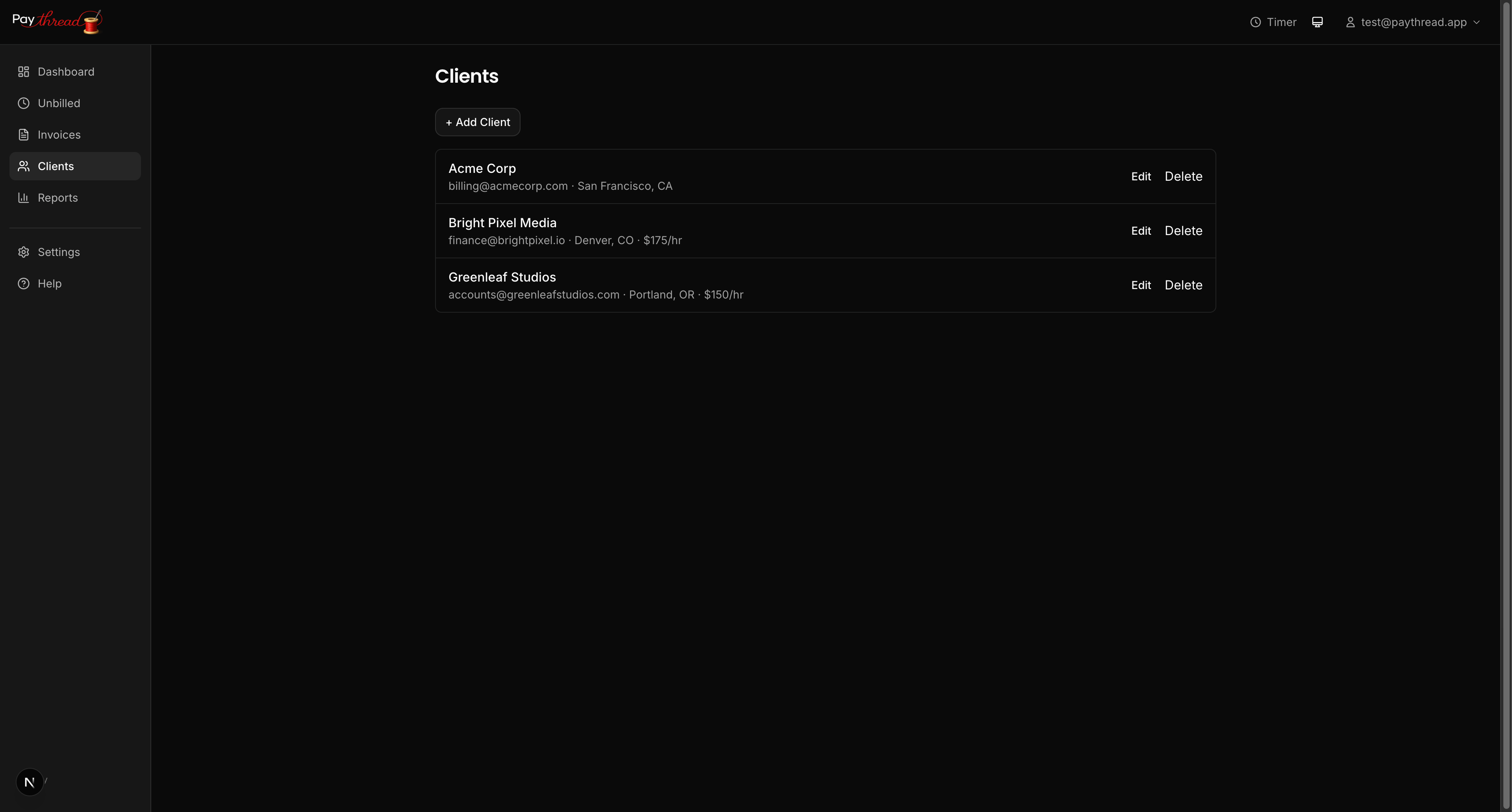 Clients are the foundation of everything in Paythread. Every work item and invoice is tied to a client, so you'll want to add at least one before doing anything else.