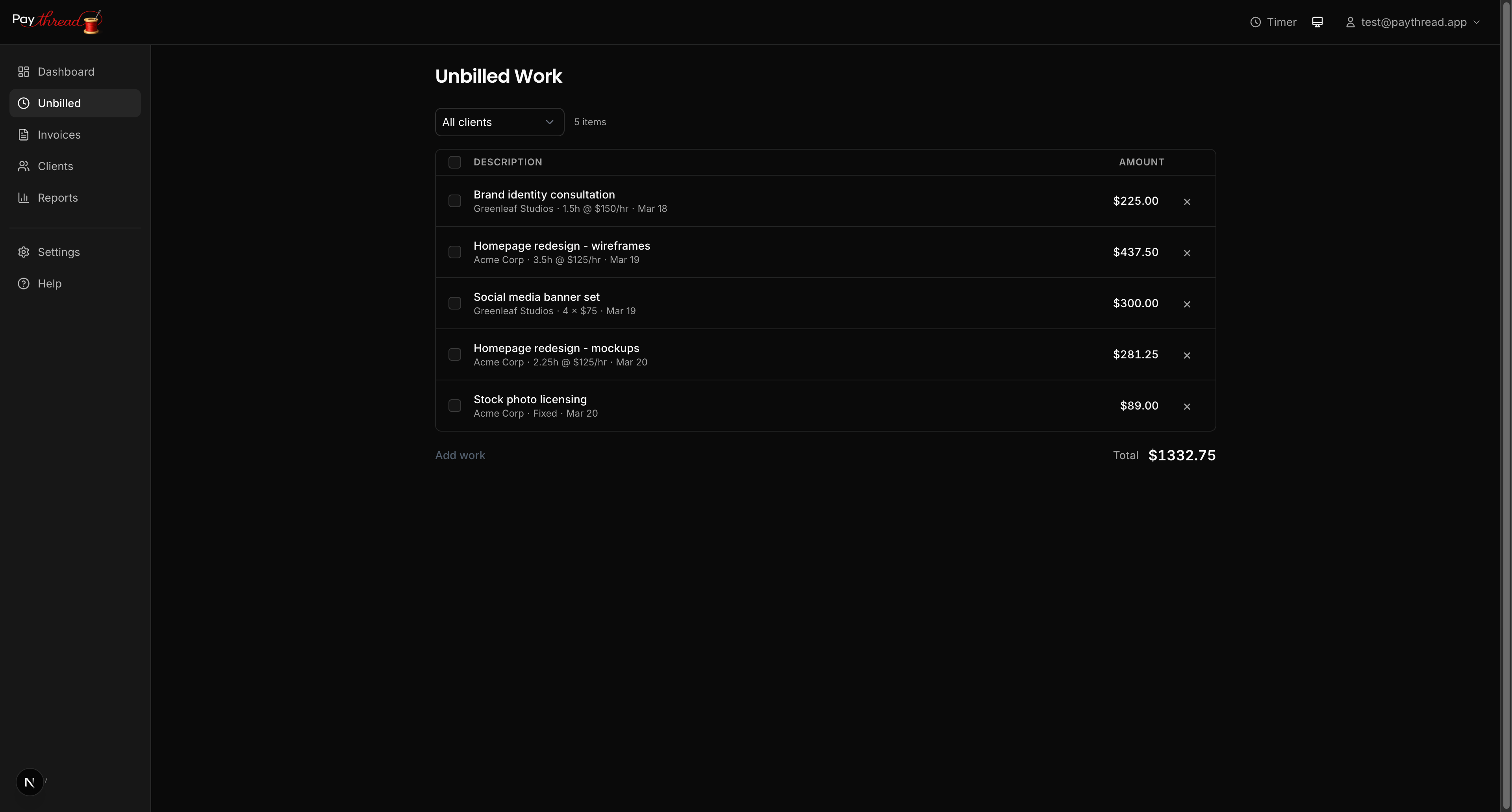 Once your unbilled queue is clean, select the items you want to invoice. You can group items by client, by project, or by time period. Paythread lets you select multiple items and batch them into a single invoice.